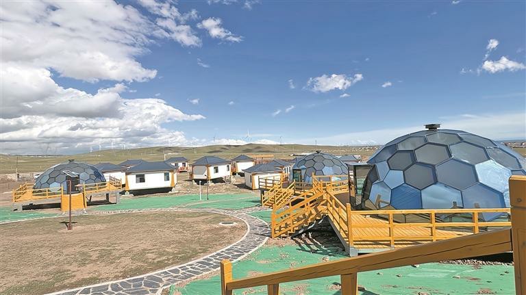 初夏,高原的風裹挾著清新的草香拂過臉頰。沿著小路漫步前行,不一會兒,一座充滿未來感的深藍色星空房出現在眼前。“相比傳統帳篷,星空房具備更強的防風、防雨、保溫性能,能為游客提供更安全、舒適的住宿環境。”張明邊走邊說,項目分兩期建設,一期投入582萬元,建成16套餐飲帳篷;二期投入山東援建資金1011萬元,建成31頂住宿帳篷,目前正在收尾階段。