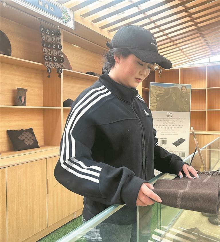 在村寨核心地段的“藏城之窗”體驗區,剛剛大學畢業的村民多杰吉正在擺放綠松石、瑪瑙等具有民族特色的飾品。“這里是我們村集體經濟的一部分,2024年7月開業,現在為9家公司和20多個手工作坊代售商品。除了牦牛肉干、沙棘果汁等農特產品,這種牛絨制成的圍巾和帽子也很受歡迎。”多杰吉熱情地取下一條牛絨圍巾,未經過染色處理的棕黑色圍巾摸上去質地十分柔軟。