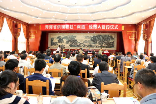 青海新聞網訊(本網記者 陳文淵 攝影報道) 6月11日上午,由青海省供銷合作社主辦的第五屆特色農畜產品推介洽談會簽約儀式在西寧賓館舉行,包括香港、臺灣地區客商,上海、河北、內蒙古、浙江等21個省100名經紀人,與青海省供銷系統內的100名經紀人簽訂了購銷合同。簽約意向金58億元,比去年增長9億元。