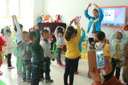 小朋友們和老師一起跳起手語舞“感恩的心” 陳文淵/攝