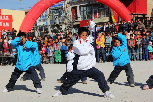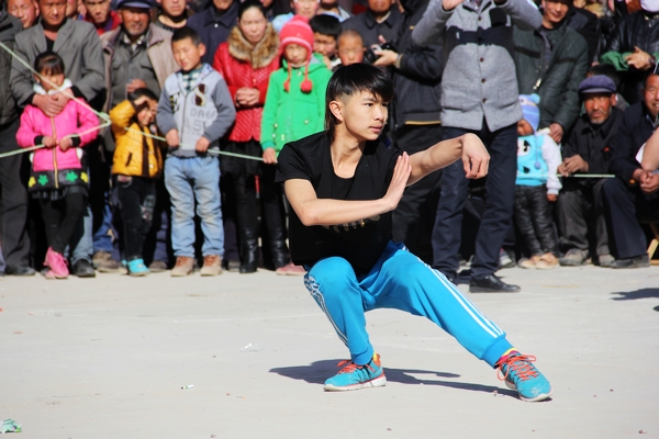 14日的早上,陽光明媚,當溫暖的陽光斜照在農家院子里時,廣場上響起了《男兒當自強》歌曲,不一會兒時間,廣場上便站滿了人。“你看、你看,那小孩子真可愛。”當表演武術的小孩們走上舞臺時,觀看的人群中發出祝福的話語。