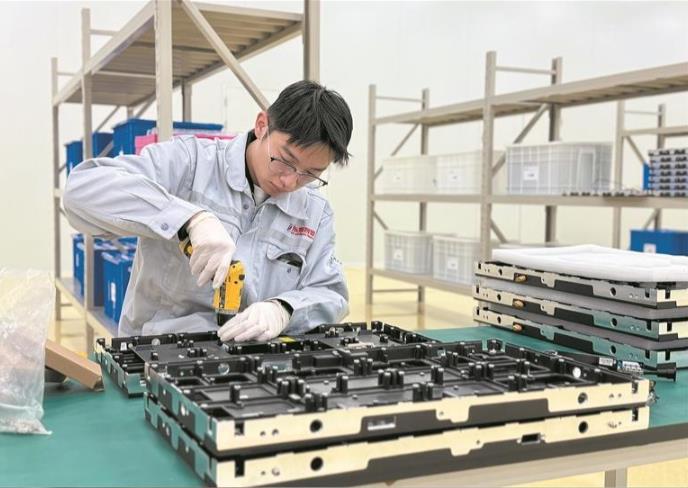 心無旁騖,埋頭實干。如今,這條匯聚了大家心血的生產線真實呈現在眼前。透過參觀通道的玻璃,技術人員正專注操作。據介紹,生產線采用先進固晶工藝,可實現微米級LED芯片封裝,配合自主開發的工藝與高精度設備,能生產毫米級以下像素間距的顯示模組。產品電路采用節能的共陰驅動技術,功耗顯著低于OLED與LCD屏,真正實現超高能效與長效續航。