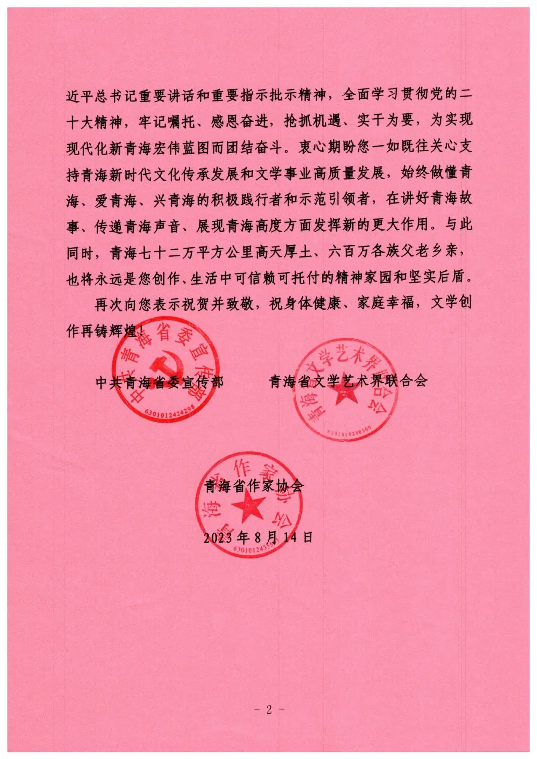 為感謝楊志軍先生以文學高峰之作為曾生活和工作過的雪域高原造像,為青海各族人民塑形,中共青海省委宣傳部聯合省文聯、省作協向楊志軍先生致信祝賀。