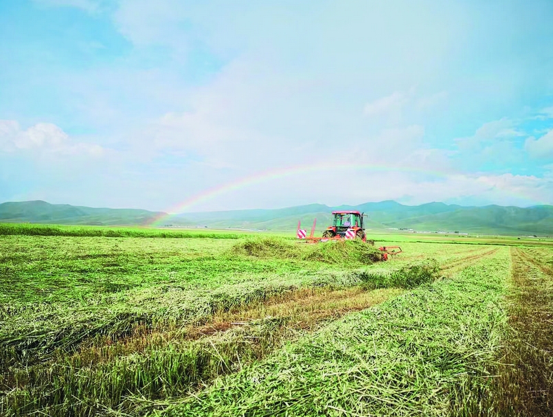 鮑奎說,這些年來,在青海省農業農村廳、當地政府以及科研單位的大力支持下,公司牧草產業實現了穩步發展。經過4年來的努力,公司將農機與農藝有效融合,在尕海鎮和蓄集鄉通過柴達木盆地鹽堿地綜合改良集成技術應用,共計將3666.6公頃鹽堿地開發成了優質飼草種植地。