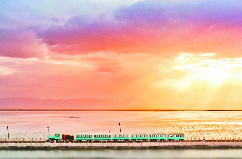 11月的茶卡鹽湖景區(qū)已經(jīng)過(guò)了最佳游覽期,但壯美景色不減。乘坐游覽火車(chē)一路向前,左右就是一望無(wú)際的奶綠色鹽湖,遠(yuǎn)遠(yuǎn)還能看到已經(jīng)成為裝飾的采鹽船。行至鹽湖深處,北面是祁連山、南面是昆侖山,這個(gè)季節(jié)可以看到雪山映湖的絕美景色。