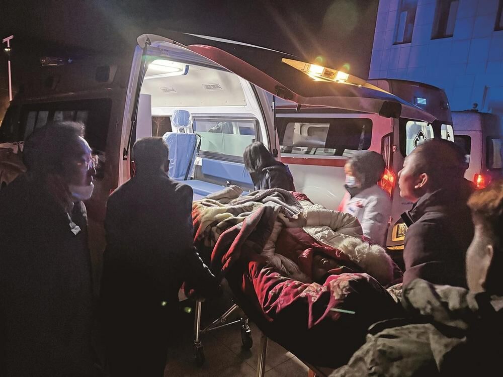 3時30分左右,西海全媒體第一采訪小組到達民和縣官亭鎮。進入鄉鎮的路很黑,但依然能看到街道兩邊房屋墻體受損的痕跡,路面有許多碎石。道路兩旁,有群眾在路邊生火取暖、搭帳篷。救護車停在開闊地,救援車輛有序駛向不同村子。就在記者采訪時,有傷者被運送過來,被抬上救護車,送往醫院救治。