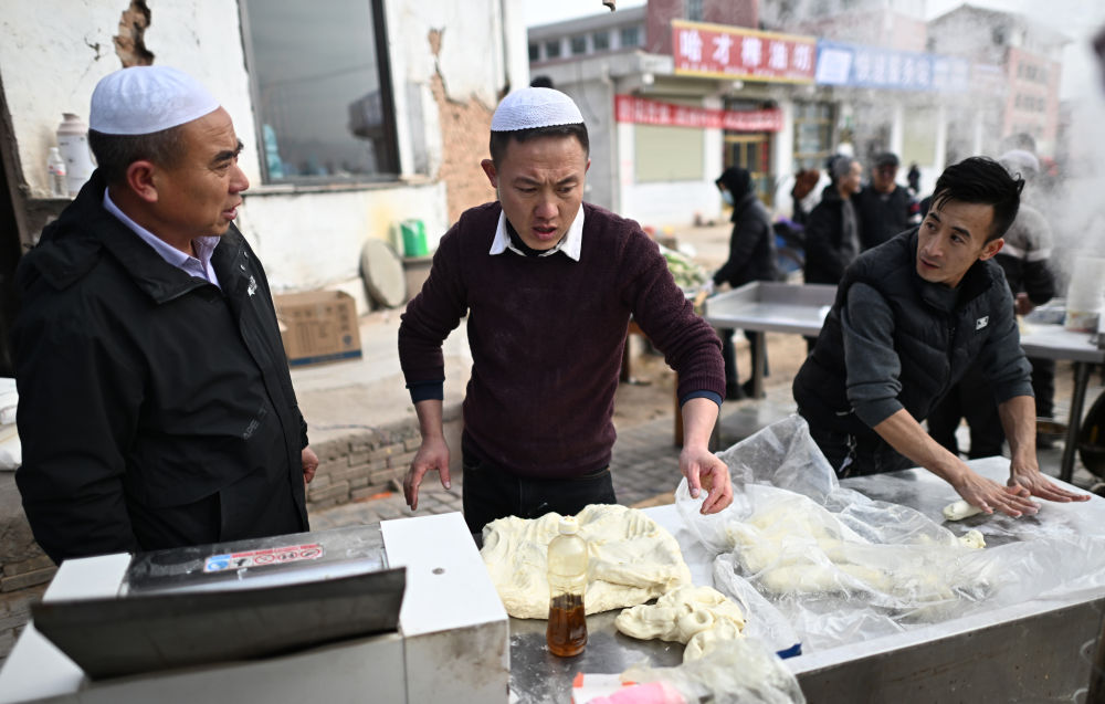 12月20日,在青海省民和縣官亭鎮(zhèn),馬俊海(左二)在拉面攤上和面。新華社記者 周盛盛 攝