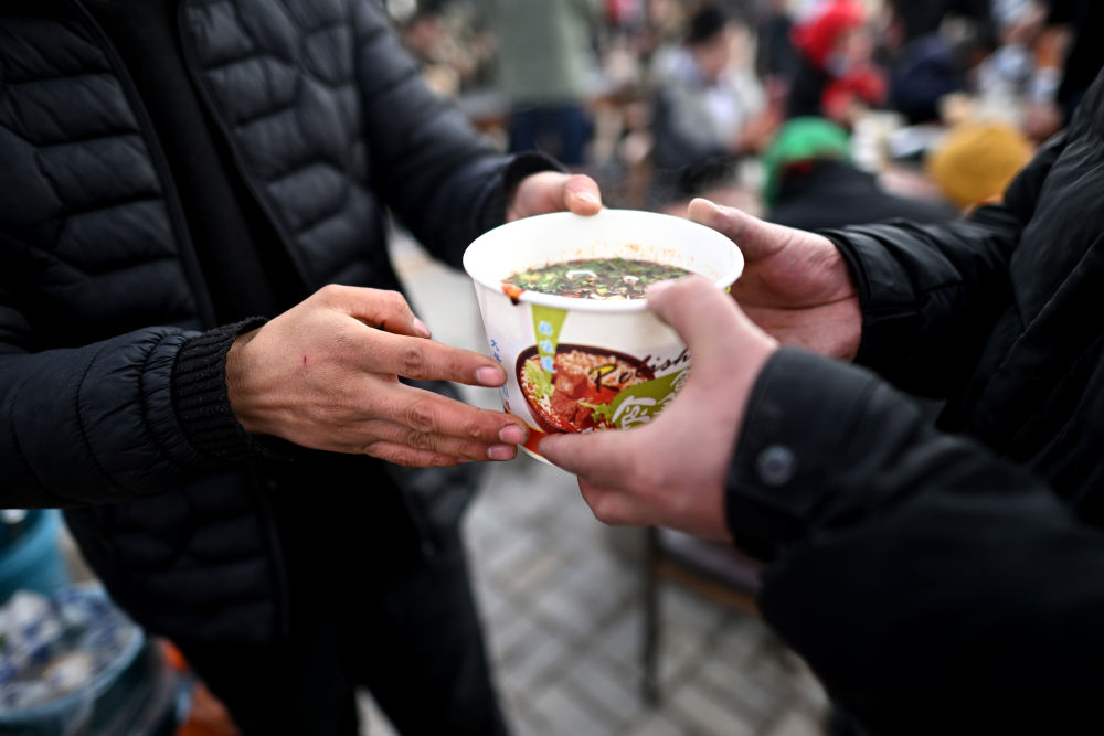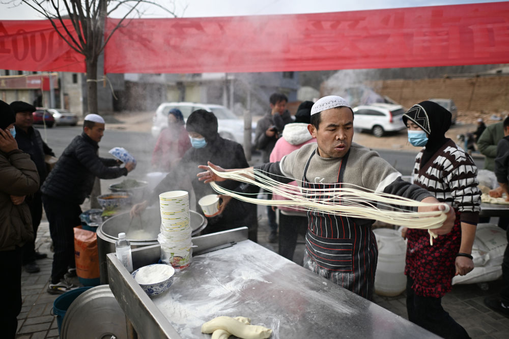 12月20日一早,馬俊海和家人購買了20袋面粉,在受損的店鋪前支起鍋灶,為鄉(xiāng)親們免費(fèi)做拉面。小小的拉面攤,人手也越來越多,鄰居和親戚們也過來一起幫忙,和面、拉面、調(diào)湯、盛面……一碗又一碗熱氣騰騰的拉面送到了鄉(xiāng)親們的手中,驅(qū)走冬日的嚴(yán)寒。