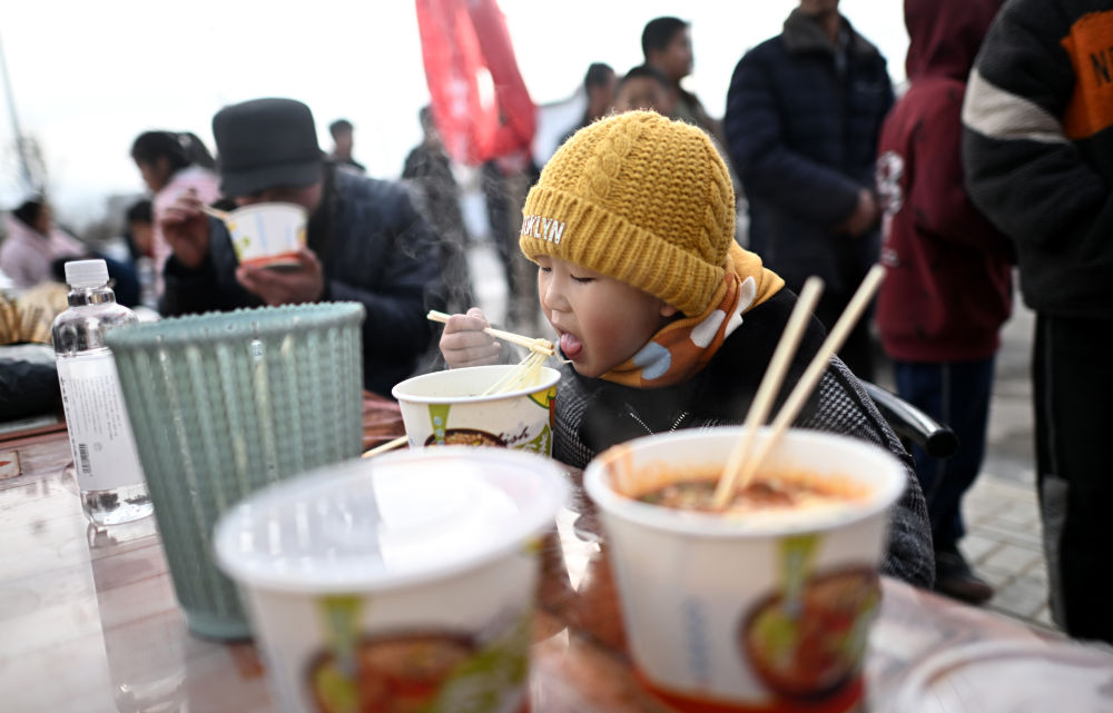 12月20日,在青海省民和縣官亭鎮(zhèn),當(dāng)?shù)厝罕娫诶鏀偳芭抨?duì)吃面。新華社記者 周盛盛 攝