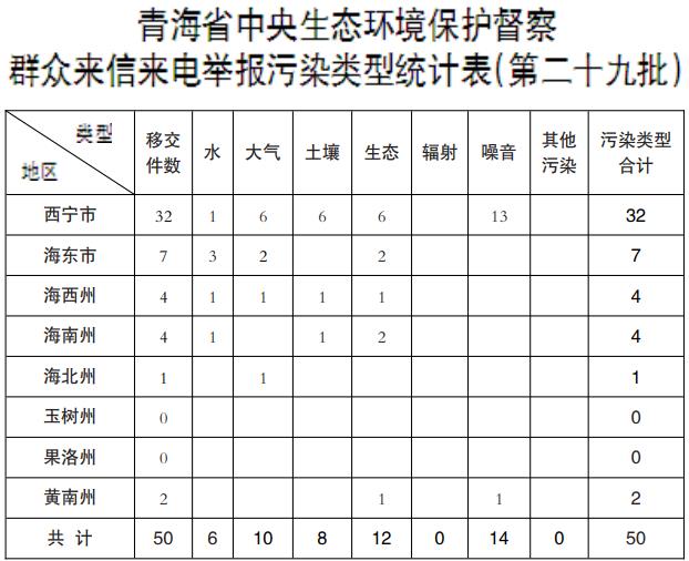 青海新聞網(wǎng)·大美青海客戶端訊 12月21日,中央第五生態(tài)環(huán)境保護督察組向青海省交辦第二十九批群眾信訪舉報件共50件(來電45件,來信5件),其中交辦重點關注件3件。交辦的50件信訪舉報件涉及全省6個市州,其中西寧市32件、海東市7件、海西蒙古族藏族自治州4件、海南藏族自治州4件、海北藏族自治州1件、黃南藏族自治州2件。群眾舉報反映問題涉及噪音污染14件、生態(tài)破壞12件、大氣污染10件、水污染6件、土壤污染8件。截至目前,中央第五生態(tài)環(huán)境保護督察組向我省交辦的第二十九批群眾信訪舉報件已經(jīng)移交相關市州和部門,各地和相關部門正在按照程序抓緊辦理。