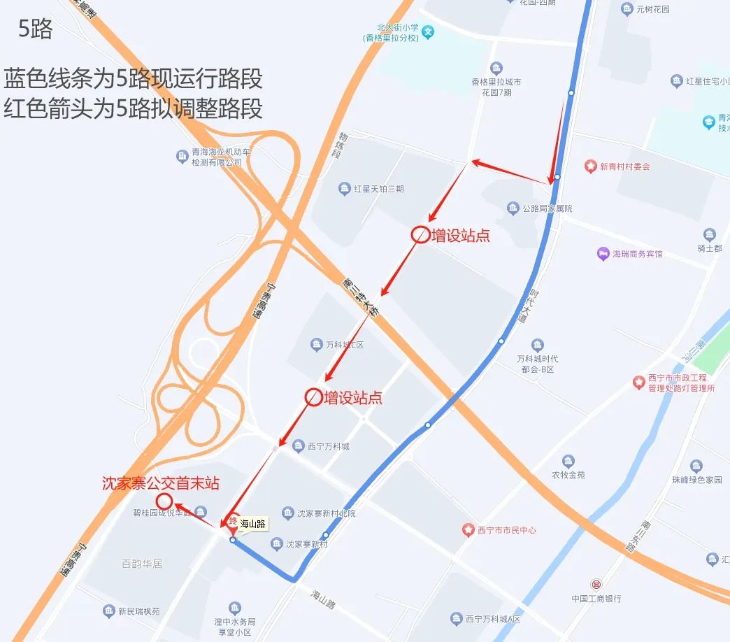 調整后5路公交車(試運行)線路走向:火車站、濱河路、黃河路、五四大街、同仁路、時代大道、安寧路、海山路,沈家寨公交首末站,單程11.5公里。增設“安寧路北”東西兩側站、“安寧路南”東西兩側站、“沈家寨公交首末站”南北兩側站;取消“春暉路口”東西兩側站、“市民中心西”東西兩側站、“沈家寨新村”西側站、“海山路”北側站。