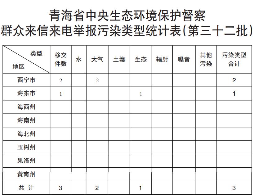 青海新聞網·大美青海客戶端訊 12月24日,中央第五生態環境保護督察組向青海省交辦第三十二批群眾信訪舉報件共3件,均為來信件。交辦的3件信訪舉報件涉及西寧市2件、海東市1件。群眾舉報反映問題涉及大氣污染2件、生態破壞1件。截至目前,中央第五生態環境保護督察組向我省交辦的第三十二批群眾信訪舉報件已經移交相關市州和部門,各地和相關部門正在按照程序抓緊辦理。