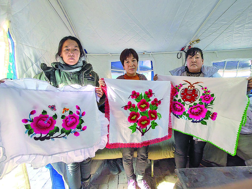 紅色的牡丹花、石榴、海棠,金黃色的蝴蝶,青色的鴛鴦,粉紅色的鳳凰……12時許,草灘村安置點(diǎn)的藍(lán)色帳篷內(nèi),婦女們拿著象征美好生活的刺繡,一一交到草灘村婦聯(lián)主任辛勤英的手里。
