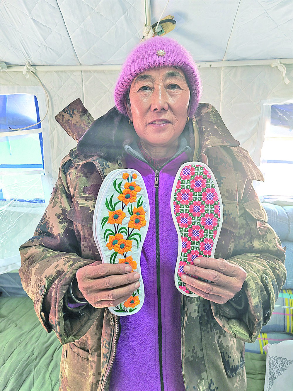66歲的村民蔣香蘭走進(jìn)帳篷,把自己繡的鞋墊遞給了村干部。“我腿腳不好,讓老阿爺跑了一趟,拿了大小5雙鞋墊,這是我們家的一點(diǎn)心意。”她說。
