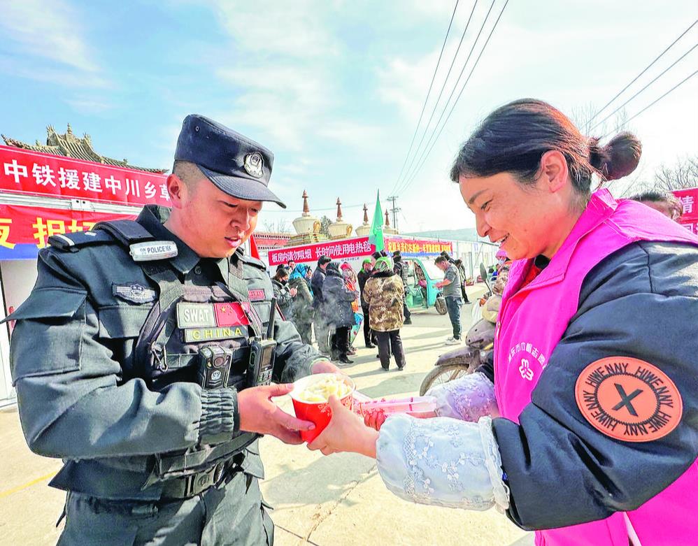 2024年1月1日,省、市、縣、鄉(xiāng)、村五級(jí)婦聯(lián)組織和巾幗志愿者走進(jìn)海東市民和回族土族自治縣中川鄉(xiāng)草灘村,為受災(zāi)群眾和堅(jiān)守在一線(xiàn)的工作人員送上熱氣騰騰的餃子。