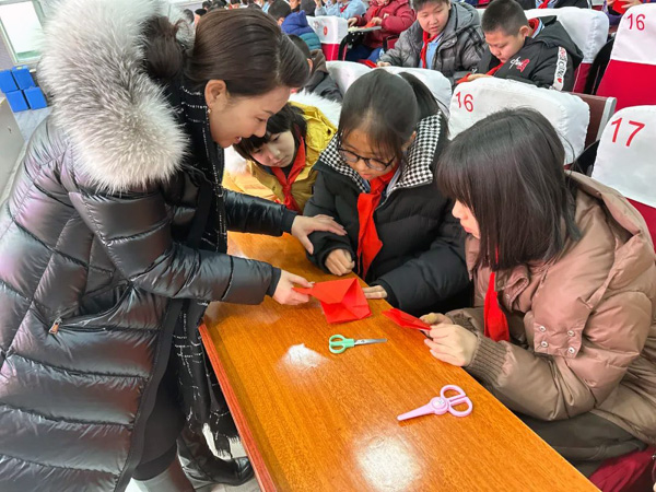 當日,城東區屬學校共同開展剪紙迎新春活動。在學校老師的細心指導下,折紙、繪圖、下剪、鏤刻、裝裱……有的在教室里一邊觀看視頻,一邊裁剪;有的人坐在風雨操場,聽老師指導完成送給特殊人群的新春禮物;有的在校園禮堂,共同體驗剪紙文化的智慧。孩子們在創作中放飛想象的翅膀,在裁剪中感受傳統工藝的魅力,樂此不疲地享受著剪紙的樂趣。
