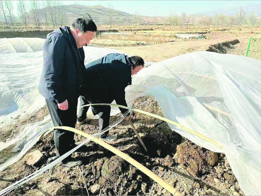 大通縣農業技術推廣中心專業技術人員和合作社負責人查看覆膜糞肥的發酵情況。