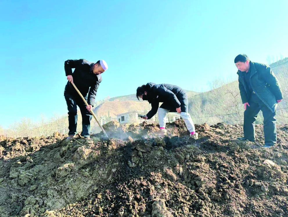 大通縣農業技術推廣中心專業技術人員和合作社負責人挖開發酵的糞肥查看內部情況。