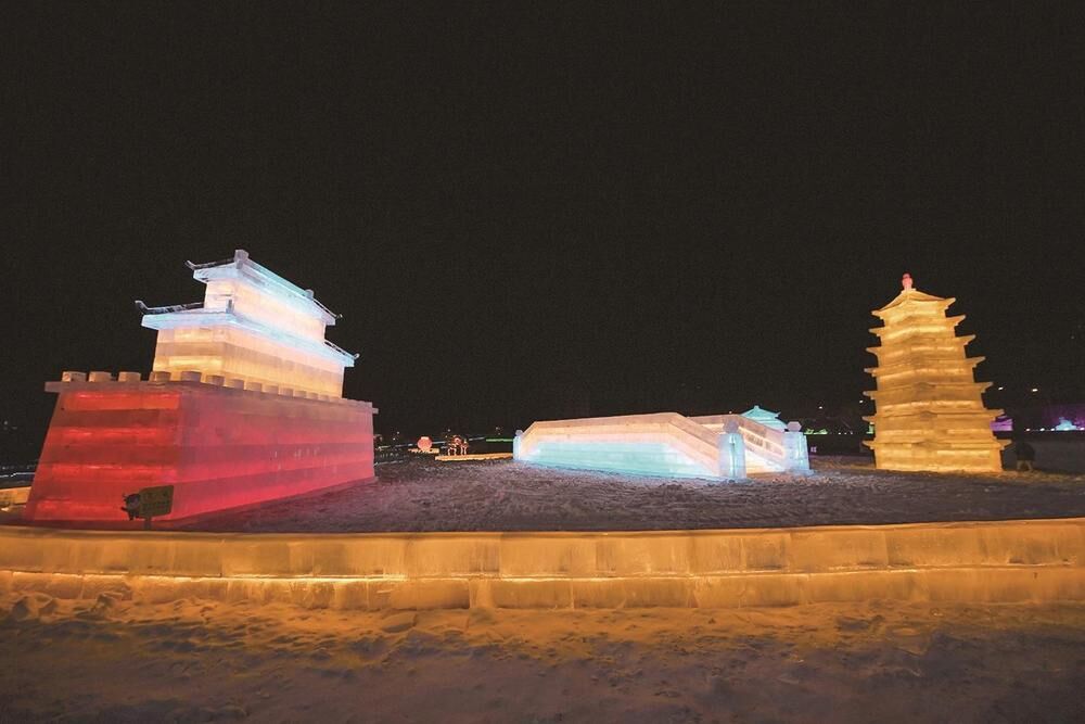 與冰雕相伴的還有一座30米長、10米高的大型主題雪雕,14米高的巨型地標雪人及大小不一的40個景觀雪人憨態(tài)可掬。白天,冰雕景觀晶瑩剔透、光潔無瑕,仿佛把《冰雪奇緣》的場景搬進現(xiàn)實。夜晚,絢麗多彩的燈光亮起,景區(qū)猶如琉璃仙境,驚艷奪目。如果想領(lǐng)略冰雪大世界白天與黑夜不同的美,可提早入園。