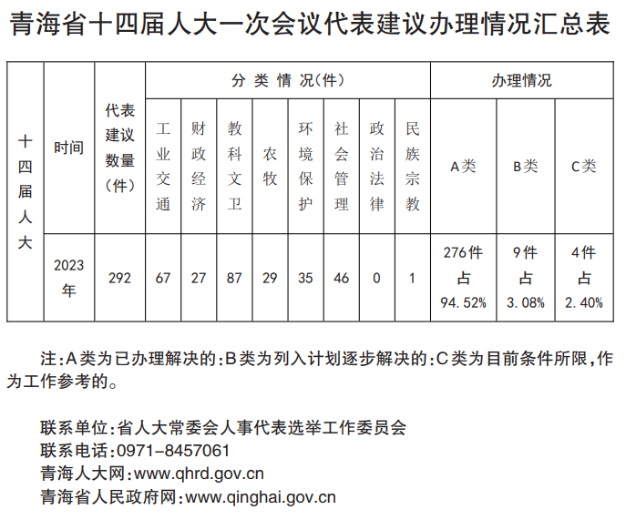 青海新聞網(wǎng)·大美青?蛻舳擞 人大代表提出建議,是代表參加行使國家權(quán)力的重要形式,是憲法法律賦予代表的重要權(quán)利。省十四屆人大一次會議期間,代表們共提交建議292件,均已按期辦結(jié)并答復代表。按類別分:教科文衛(wèi)方面87件,工業(yè)交通基礎(chǔ)設施方面67件,社會管理和其他方面46件,環(huán)保方面35件,財政經(jīng)濟方面27件,農(nóng)牧方面29件,民族宗教方面1件,件件聚焦我省高質(zhì)量發(fā)展大事要事、回應民生熱點難點。
