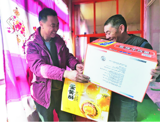 樂都區中嶺鄉馬家洼村第一書記祁萬強給村民李積寶拜年。攝影:田得乾