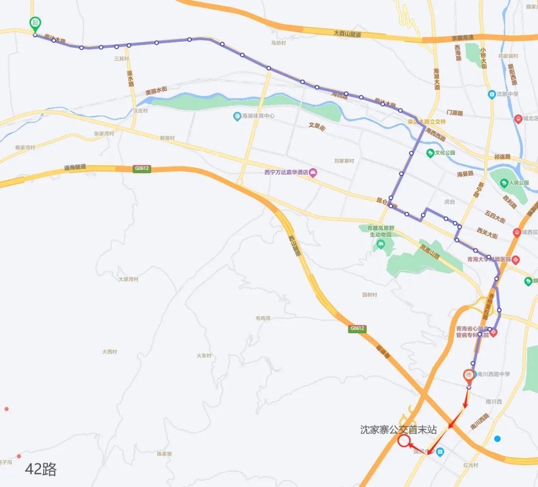 線路走向:沈家寨公交首末站、海山路、時代大道、磚廠路、南川西路、香格里拉路、昆侖西路、新寧路、西關大街、冷湖路、昆侖西路、海湖路、柴達木路。