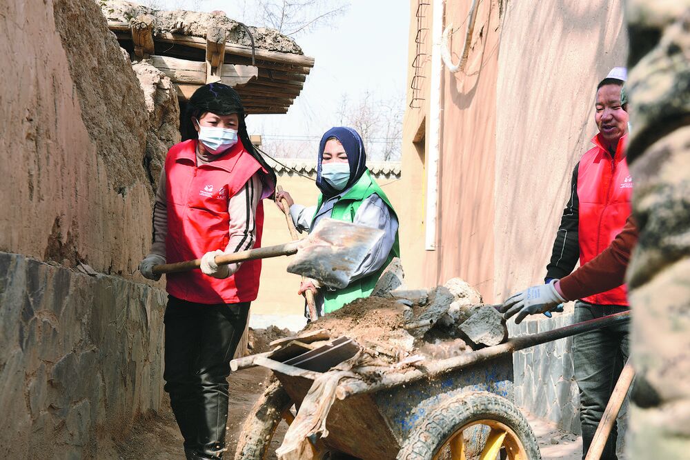 記者來到循化撒拉族自治縣清水鄉塔沙坡村時,村黨支部書記韓迎新正跟二十幾名村民在巷道里清理房屋倒塌的廢棄物和垃圾,馬甲后背上“重振家園”四個大字格外引人注目。