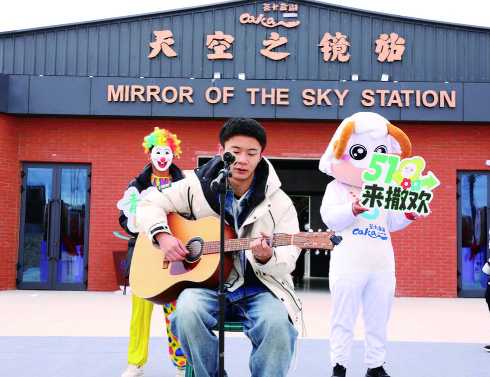 以“天空之鏡”為幕布,用高山草原組混響。一支話筒的矗立就是一個(gè)舞臺(tái),成就無(wú)數(shù)游客的歌唱夢(mèng)想。為不斷豐富游客體驗(yàn),茶卡鹽湖景區(qū)全新設(shè)置“全民K歌”區(qū)域,讓游客沉浸式打卡鹽湖風(fēng)光。