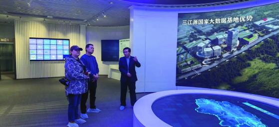 冉永明(右一)為西海全媒體記者介紹中國聯(lián)通(青海)三江源國家大數(shù)據(jù)基地運(yùn)行情況。盧曉蓉 攝