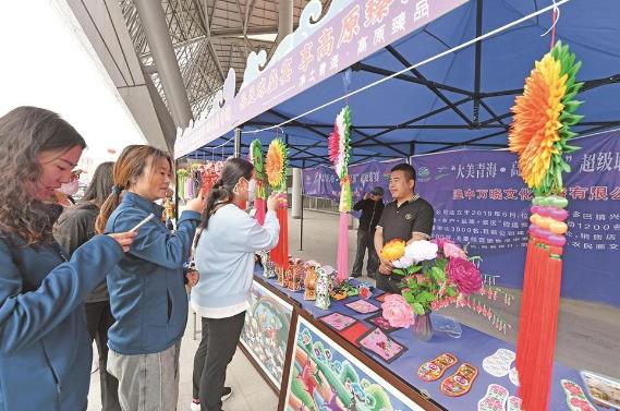 青繡產(chǎn)品展示區(qū),市民在眾多青繡產(chǎn)品中挑選喜歡的款式。市民陳女士一邊攝影,一邊告訴記者,在體育中心逛了一圈,她已經(jīng)欣賞到了湟中農(nóng)民畫、河湟剪紙等多個(gè)非遺項(xiàng)目,感受到了青海各地的民俗風(fēng)情,很有收獲。