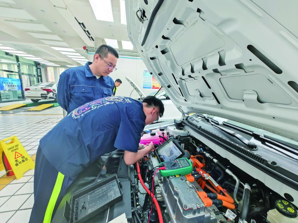 新能源汽車運(yùn)用與維修專業(yè)學(xué)生進(jìn)行冷卻系統(tǒng)故障排除。