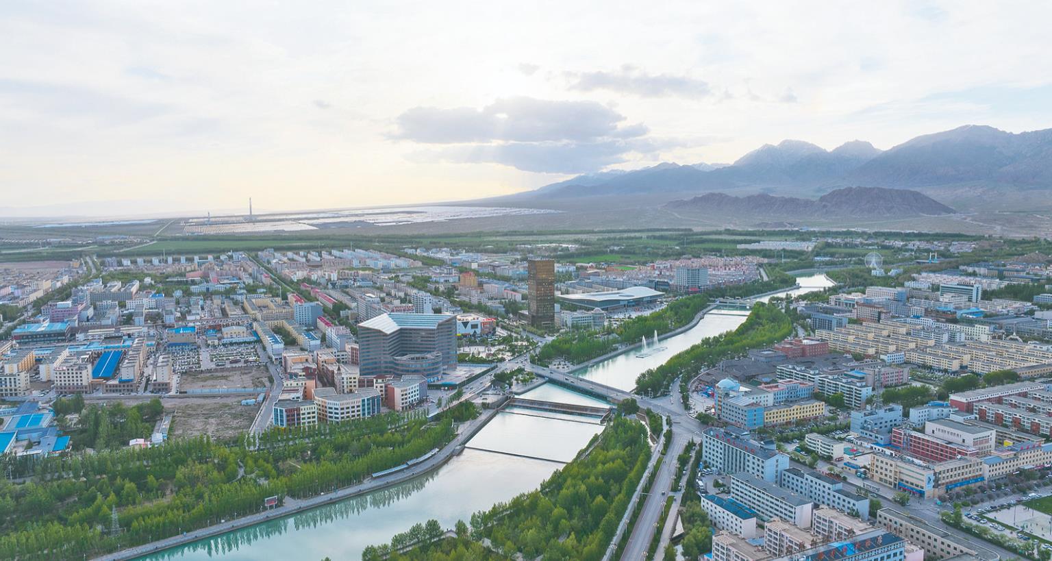夏日,走進德令哈市,天空碧藍,巴音河水天一色,座座新建的高樓、廠房鱗次櫛比,光伏板吸光發電,熱熔鹽塔成為了城市地標,一個個百億級項目紛紛落戶,生產建設現場迸射著奮進的火花。