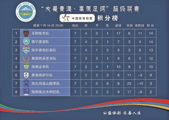 目前,玉樹牦牛隊(duì)和西寧夏都隊(duì)同是4勝2平1負(fù),積14分,但玉樹牦牛隊(duì)以凈勝球優(yōu)勢(shì)位列第一,海東拉面隊(duì)、黃南熱貢藝術(shù)隊(duì)、海南龍羊隊(duì)、果洛格薩爾隊(duì)、海北祁連山藏羊隊(duì)、海西柴達(dá)木枸杞隊(duì)分列第三位至第八位。