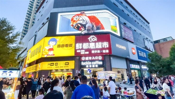 隨著盛夏的到來,市民夜間出游的熱情持續升溫,夜間消費市場日趨活躍。該3D裸眼大屏點亮了游玩新地圖,助力了城中區“夜經濟”的發展。靈動飄逸的中國龍、栩栩如生的東北虎、科技感滿滿的宇航員、生動形象的海底世界等形象在3D大屏上活靈活現,全息裸眼的動畫效果既科幻又逼真,不斷變換的場景讓大家紛紛舉起手機打卡留念,老街道與新科技碰撞出了不一樣的火花,吸引了眾多消費者駐足觀看。“大新街夜市給人的感覺非常好,非常有煙火氣。忙碌了一天,可以來這里放松一下,現在又有了裸眼大屏,還能看到科技感滿滿的3D視頻。”市民楊女士夸獎道。飲馬街作為西寧市人文歷史樞紐,是西寧市旅游搜索目的地第一站,轄區內的大新街夜市有24年的歷史,是老西寧人心中公認的文、娛、游、購一體化夜市,全年車水馬龍、人流如織。