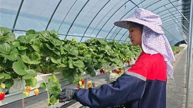東智每天的任務不僅要管護草莓,還要采摘已經成熟的草莓,在這里采摘無需彎腰,推著小車穿梭在支架間,勞動效率得以提升。