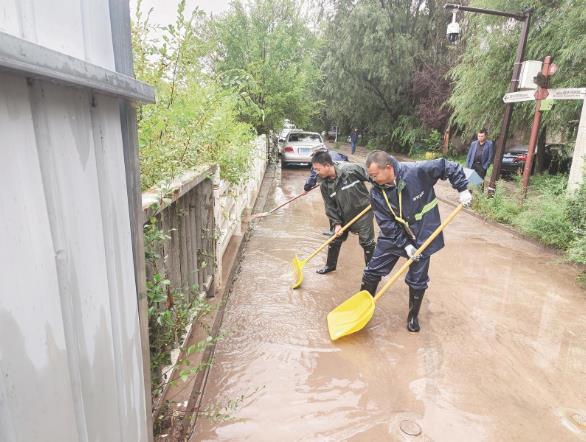 風雨中,社區工作人員、網格員和志愿者奔走于轄區平房院落、背街小巷、易積水路段,及時消除安全隱患,成為雨幕中令人溫暖的一抹“紅”。