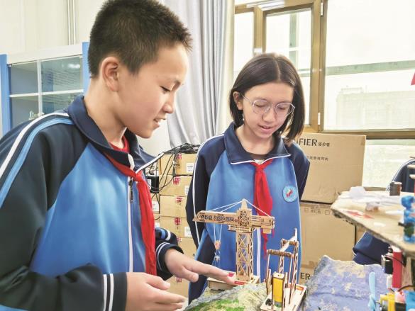 “這里是礦產資源研發(fā)及開采區(qū)和生活休閑游樂區(qū)。”學生們介紹著家鄉(xiāng)的美景。沙盤上幾臺采挖機來回轉動,旁邊的娛樂區(qū)播放著動聽的歌曲。