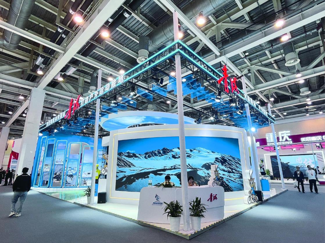 走進(jìn)青海展位,映入眼簾的是一塊巨大的環(huán)形銀幕,上面循環(huán)播放著青海的壯美風(fēng)光和精彩的體育瞬間。