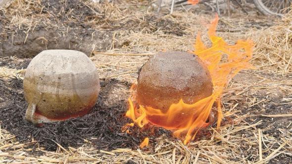 蘇寶明說,從窯洞挑出的砂罐,要及時用麥草埋進提前挖好的土坑里。“這種做法主要是為了讓燒制的砂罐顏色更加明亮,更加好看。”蘇寶明將一個燒得通紅的砂罐放進土坑,隨后由家人迅速蓋上麥草,土坑頓時冒出高高的火焰,隨后又瞬間熄滅,待砂罐的溫度慢慢降下來后便可取出。