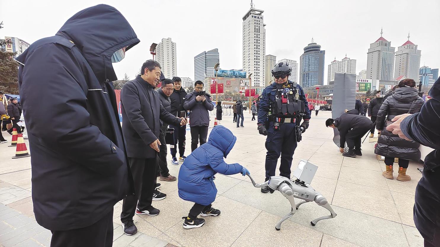 在室外的大型裝備展示區圍滿了群眾,現場展出了高精度狙擊槍、警用手槍、無人機等平日里難得一見的警用器械,讓大家得以近距離目睹公安力量的強大硬件支持。在公安科技展示區,無人機喊話、機器狗等警營“黑科技”也紛紛亮相。機器狗現場展示了跑、臥、舉等運動技能,還能與觀眾互動,讓群眾切實感受到科技在警務實戰中的重要作用。