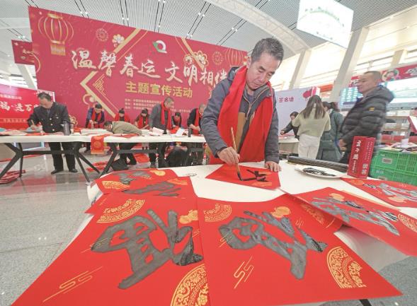 書法愛好者現場揮毫,為旅客免費書寫春聯,送上新春祝福。老家在重慶的張女士說:“今天回老家過年,正好趕上火車站舉辦這個活動,特意帶了一張福字回家。新的一年,希望家人能夠平安、幸福。”