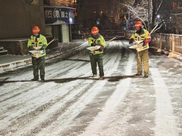 1月24日夜間至1月25日凌晨,市、區兩級城管環衛部門搶抓夜間清雪黃金時段,重點保障主要街道、立交匝道、彎道坡道、橋梁、十字路口、醫院周邊等路段,先行撒布融雪劑。凌晨3時起,集中安排大型掃雪滾刷車進行多車編組、多輪次循環的攻堅作業。