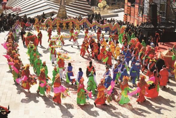 當日13時許,活動現場彩旗飄飄,鑼鼓喧天,好不熱鬧。舞龍、舞獅、抬花轎、旱船……200余名社火表演者身著絢麗多彩的服飾,手持各種道具,載歌載舞,營造出歡快熱烈的氛圍。社火表演團隊里,有小到5歲的幼童,也有60多歲的老人。