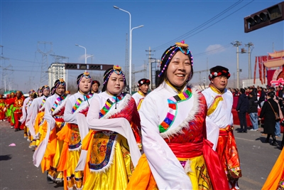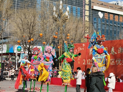 2月9日上午10時,城東區邀請的兄弟縣區的優秀社火從大眾街德令哈路十字路口、大眾街共和路十字路口,依次向建國路西寧大廈十字路口巡游展示。湟中區大才鄉傳統的旱船、高蹺、大頭娃娃等社火表演,充分展示了青海民間傳統文化的魅力,讓轄區群眾在家門口感受了一場豐盛的文化大餐。據統計,加上區級社火隊,當日共有38個節目、1631名演職人員參加表演,4個小時的演出約4.3萬群眾駐足觀看。