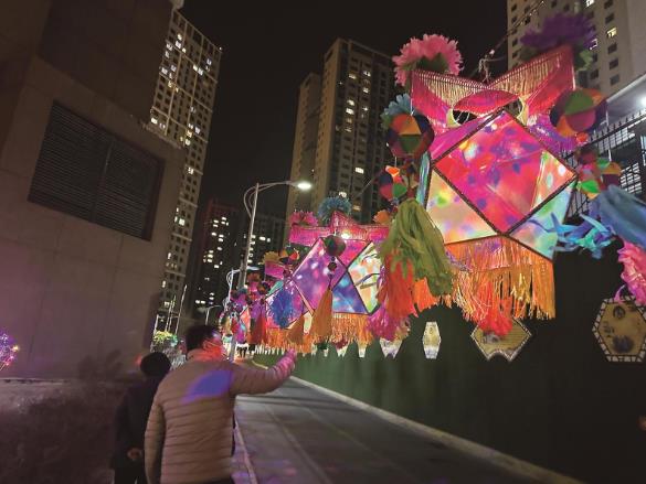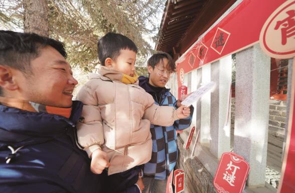 公園五峰書院周圍,五彩斑斕的燈籠下,懸掛著一條條燈謎,燈謎的內容與青海湖、茶卡鹽湖、塔爾寺、可可西里、青藏鐵路、三江源相關。參與活動的市民,有的獨自停留在燈謎前,眉頭緊蹙,思考正確答案;有的三五成群,你一言我一語,熱烈討論著。猜燈謎的現場,不時傳來歡呼聲。