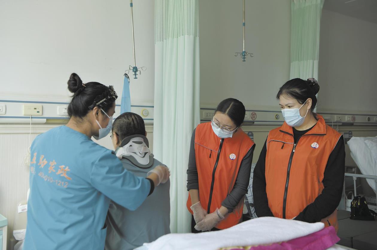“新學員”東平蘭和韓昌慧來到骨關節康復科,“老學員”正對一位病人進行“拍背”“頭部按摩”等護理工作。