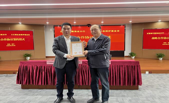 雙方正式簽訂戰略合作協議,交通銀行青海省分行向三江源生態保護基金會捐贈公益資金111萬余元,專項用于三江源國家公園管理局治多管理處辦公用房供氧設備項目和垃圾清運車購置,切實解決當地生態保護工作中的實際需求。三江源生態保護基金會為交通銀行青海省分行頒發公益證書。