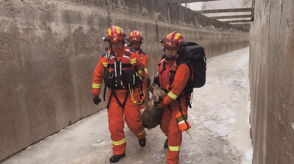 15時14分,消防救援人員到達現場,經湟源縣野生動物保護站工作人員確認,被困野生動物為國家二級保護野生動物狍。救援人員現場觀察發現,水渠深約4米,水渠內已結冰,狍因受到驚嚇,施救困難較大。