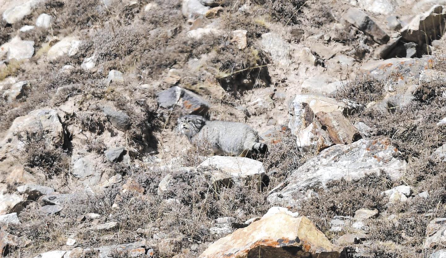 體型渾圓如毛球的兔猻,是貓科家族中的“古老隱士”。身披灰褐交錯的粗硬被毛,寬扁臉龐上鑲嵌著琥珀色吊睛瞳孔,一對短圓耳朵低伏于頭頂,使其成為巖石裂隙中的完美隱身者。兔猻作為高原生態(tài)鏈的關(guān)鍵物種,因棲息地破碎化被列為國家二級保護野生動物,每一次與人類的偶然相遇,都成為荒野生命力的珍貴注腳。