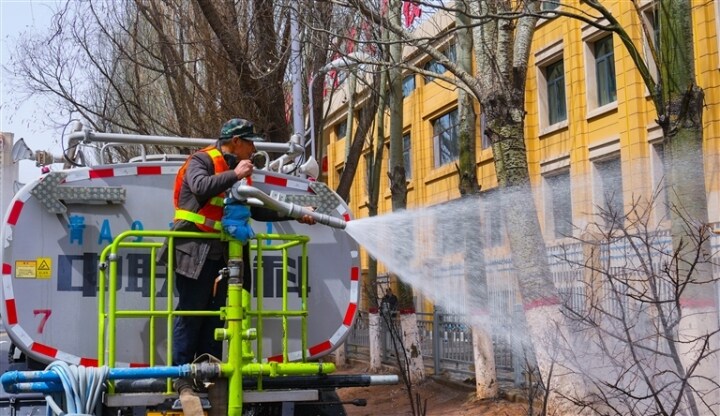 當日13時,記者來到西關大街延伸段看到,隨著高壓沖洗車的引擎轟鳴,轄區內主次干道、背街小巷的清洗作業正式拉開帷幕。道路兩邊分別有四五名環衛工人正在沖洗作業,其他環衛工人沿著沖洗的路面,拿著保潔工具正在給道路“洗臉”,個個干勁十足。沒過多久,一段原本灰蒙蒙的人行道很快回歸本色。除此之外,環衛工人組成小隊,針對路牌標識、綠植等,利用小型沖洗設備,或蹲著或彎著腰,用“繡花”功夫清理每個角落。時間一分一秒地過去,沖洗車和環衛工人的身影也越來越遠,只留下一條干凈整潔的街道。